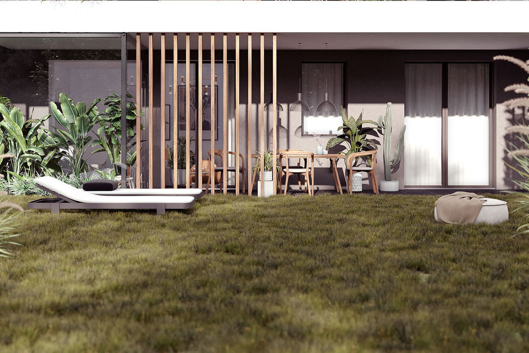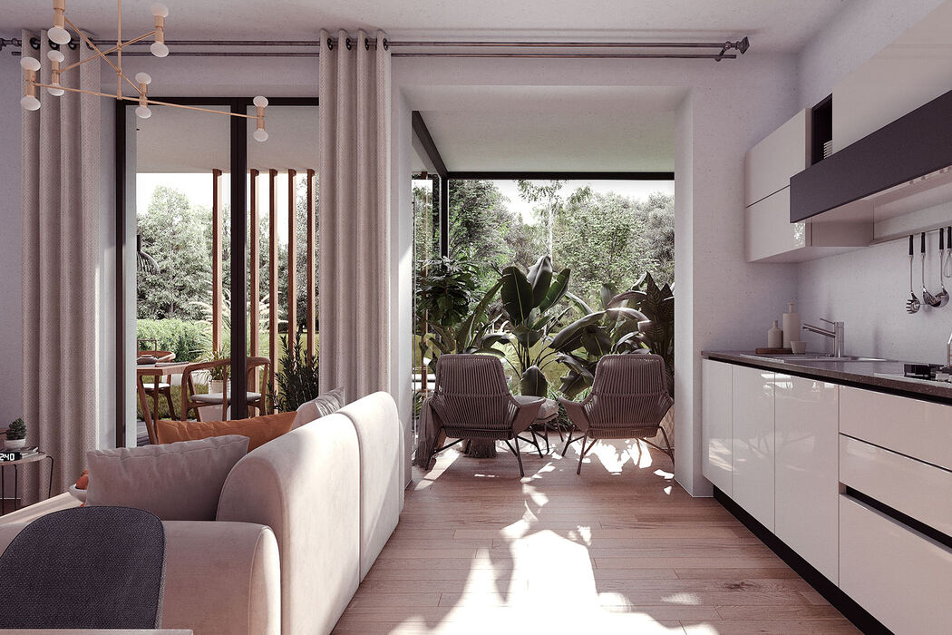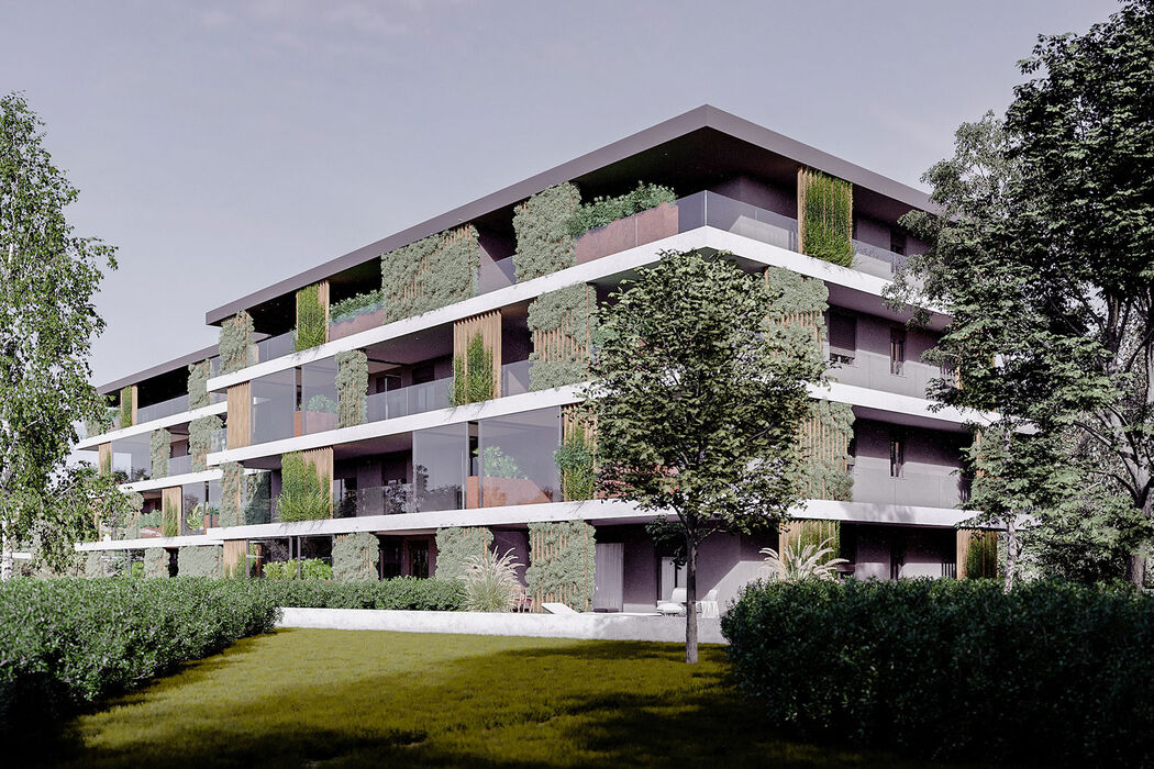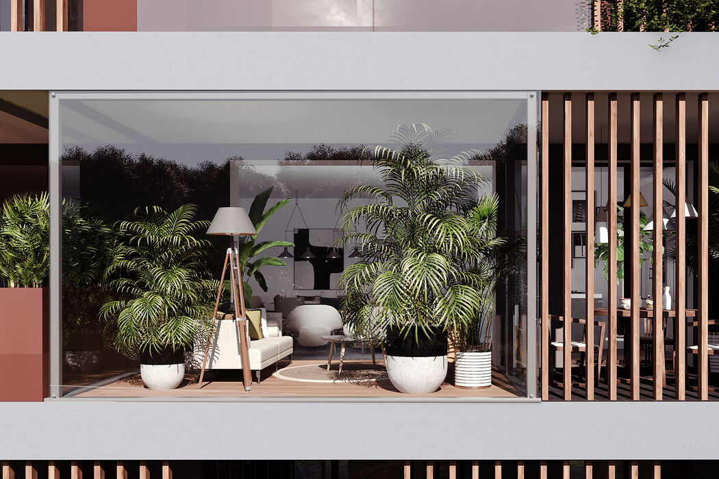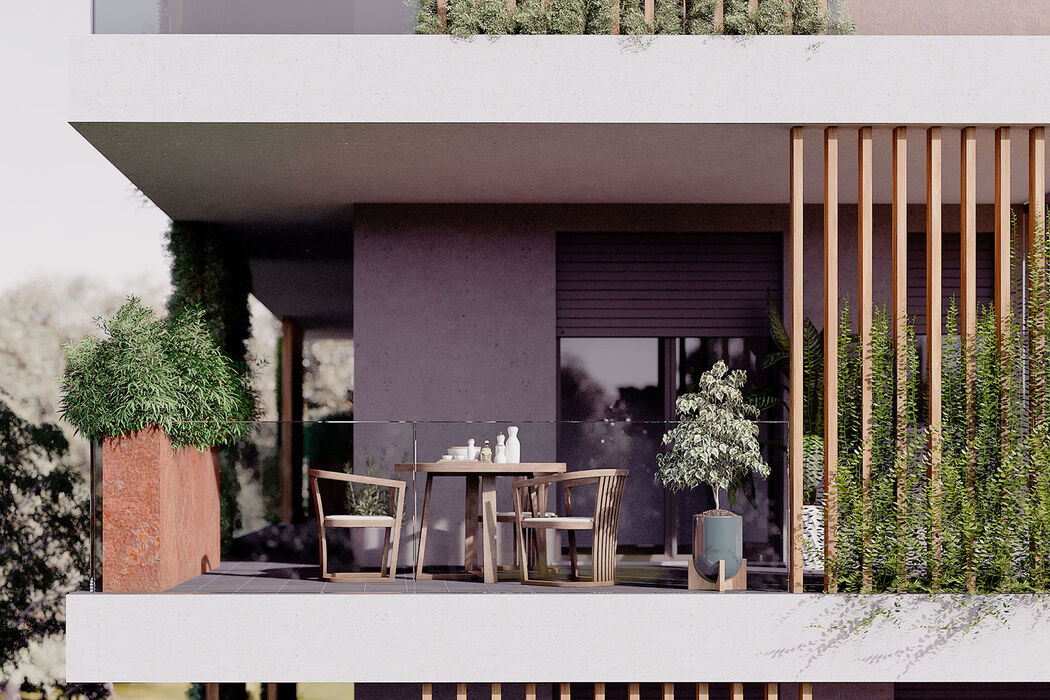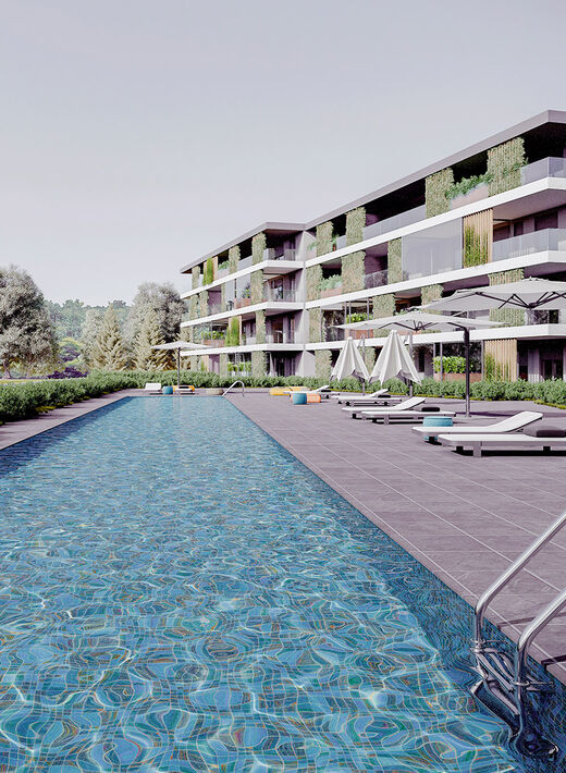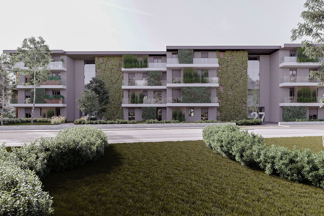 34 appartamenti, distribuiti tra 4 ingressi di 8 o 9 soluzioni l’uno, tutti con giardini, terrazzi, balconi e serre bioclimatiche. Ogni elemento è studiato per valorizzare l’emozionante contesto con piscina condominiale, parapetti di cristallo che liberano la visuale fino all’orizzonte, frangisole e verde rampicante che creano movimento e armonia alla facciata valorizzando la privacy delle singole unità abitative.