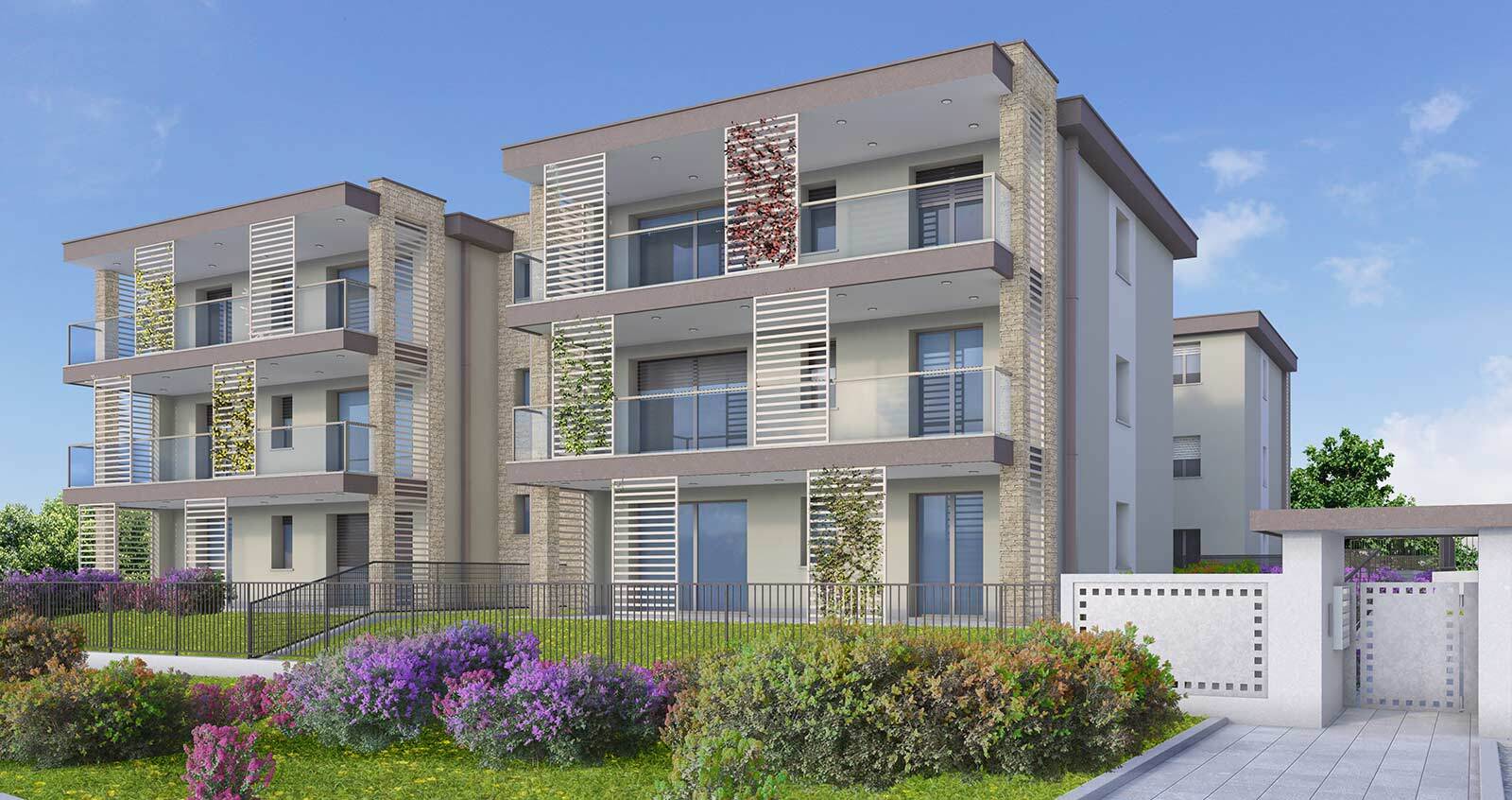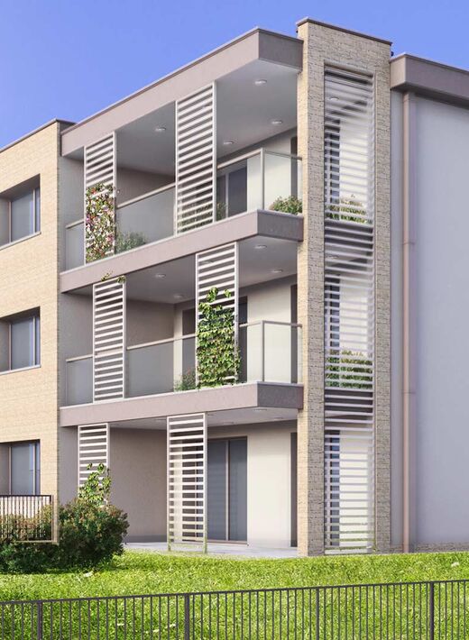 Il progetto dalle linee essenziali disegna spazi generosi e ben organizzati per ottenere abitazioni dalla dimensione famigliare e comoda: 3 e 4 locali con doppi servizi, porticati o terrazzi di grande dimensione che diventano veri soggiorni all’aperto nella bella stagione.